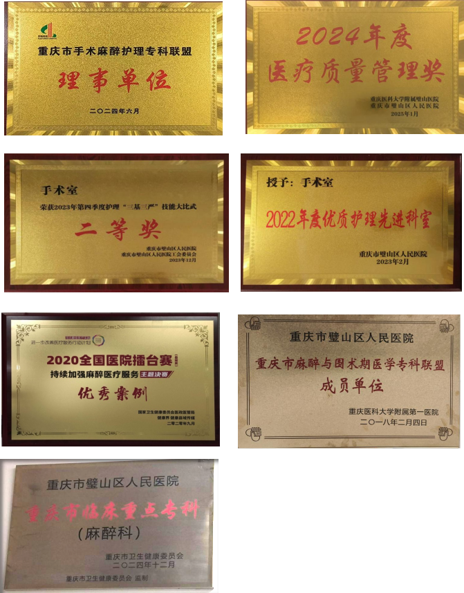 科室榮譽:我科是重慶市臨床重點專科、手術室麻醉護理專科聯盟理事單位、璧山區麻醉質控中心。獲得全國醫院擂臺賽持續加強醫療服務主題決賽“優秀案例”獎;武漢“抗疫之星”及“最美逆行者”;重慶市精準麻醉病例演講比賽“二等獎”;重慶市麻醉護理專委會創新案例大賽“二等獎”;2024年醫療質量管理獎等多項榮譽稱號。