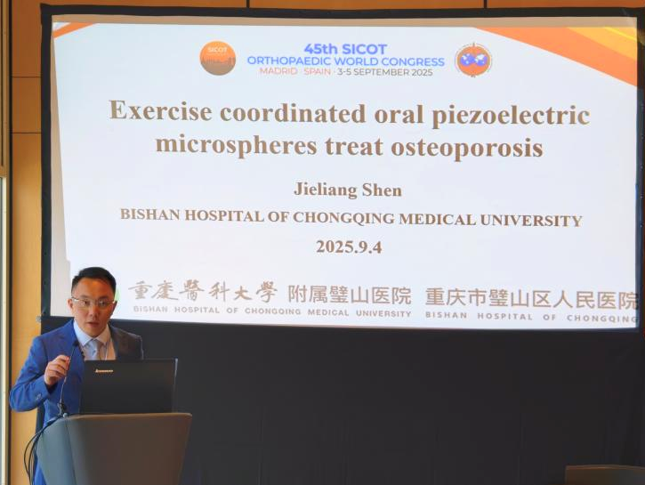 2025年9月3日至5日,由國際矯形骨科及創(chuàng)傷協(xié)會(International Society of Orthopaedic Surgery and Traumatology, SICOT)主辦的第45屆SICOT世界骨科大會(Orthopaedic World Congress, OWC)在西班牙首都馬德里隆重召開。重慶醫(yī)科大學附屬璧山醫(yī)院康復醫(yī)學科、疼痛科主任沈皆亮受邀參會,并在大會上進行了“Exercise coordinated oral piezoelectric microspheres treat osteoporosis(運動結合口服壓電微球治療骨質疏松癥)”的學術發(fā)言,在國際舞臺上展示了我院骨質疏松領域的研究成果。