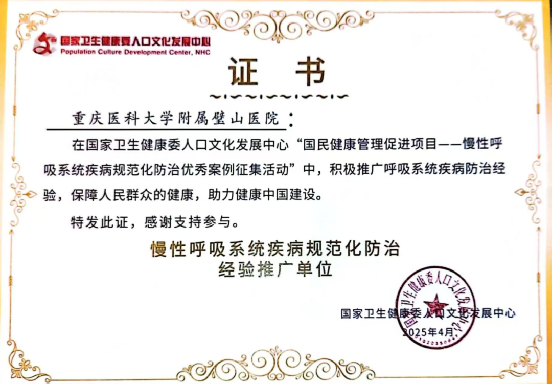 近日,在國家衛生健康委人口文化發展中心主辦的“國民健康管理促進項目——慢性呼吸系統疾病規范化防治優秀案例征集活動”中,重慶醫科大學附屬璧山醫院呼吸與危重癥醫學科憑借在慢性呼吸系統疾病防治領域的創新模式與顯著成效,被授予“慢性呼吸系統疾病規范化防治經驗推廣單位”稱號!這一榮譽標志著我院呼吸學科慢病建設與規范化管理水平獲國家級權威認可,也為區域慢性呼吸疾病防治工作樹立了新標桿。