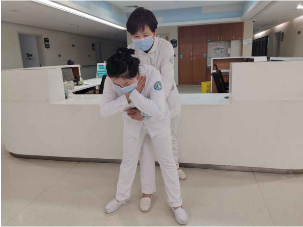 在聽到呼救聲后,護士陳萬莉、羅洪艷等人立刻沖到病房查看患者,同時通知值班醫生、楊濤護士長參與搶救。家屬因為緊張,有些“語無倫次”,但醫護人員仍舊從其描述中快速判斷患者為氣管異物堵塞造成窒息,在場護士立刻利用海姆立克急救法對患者施救,同時協助吸痰,吸氧,通知麻醉科插管。